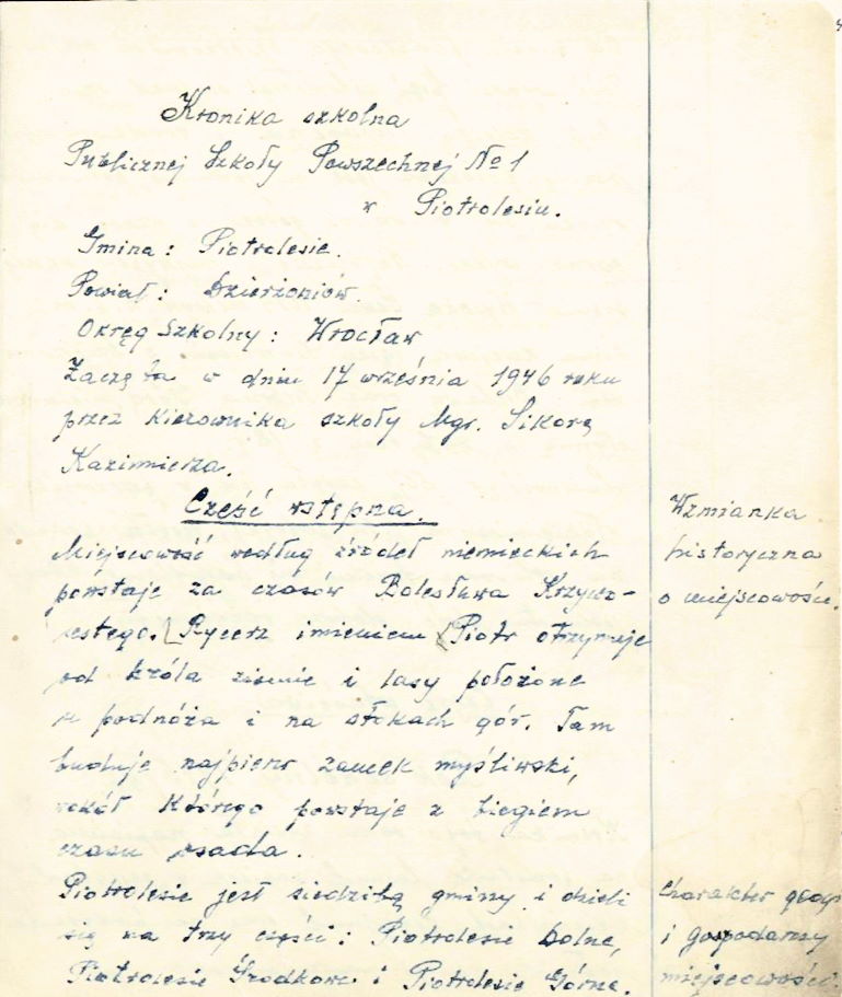 3 IX 1945 - Pierwsze posiedzenie Rady Pedagogicznej w nowo utworzonej Szkole Podstawowej nr 1, lokalizacja szkoły przy ul. Noworudzkiej nr 106.